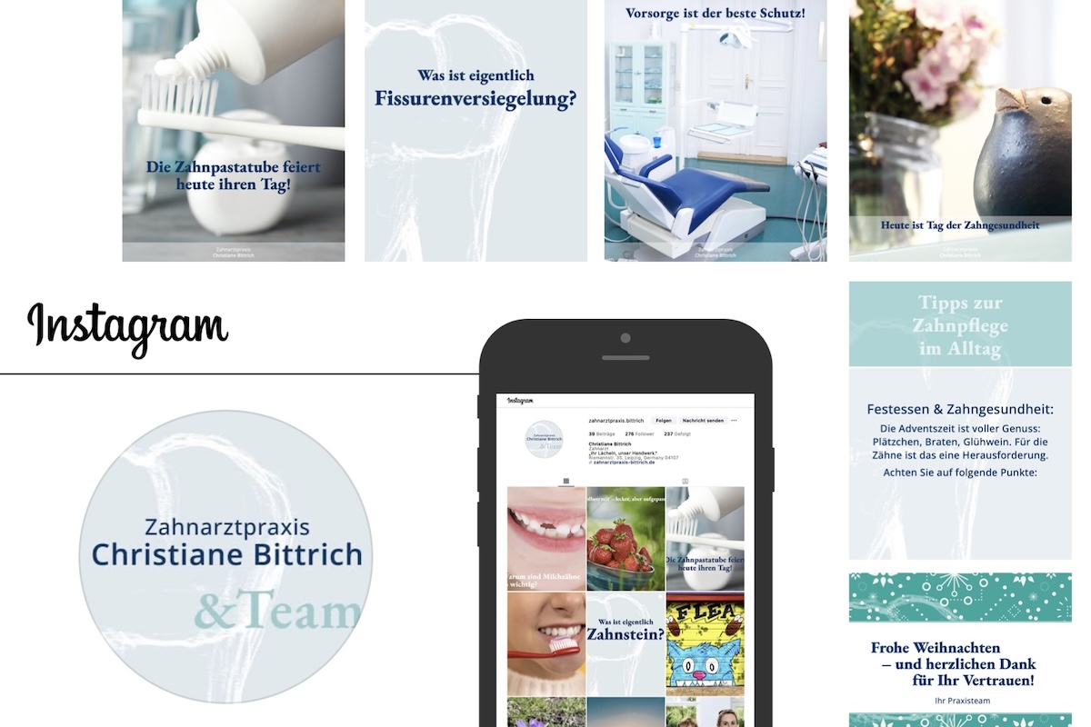 Für die Zahnarztpraxis Christiane Bittrich entstand ein familiärer und authentischer Praxisauftritt, der Vertrauen schafft und die persönliche Atmosphäre der Praxis widerspiegelt. Die Website verbindet klare Strukturen mit einer freundlichen Bildsprache und vermittelt Zahngesundheit auf verständliche, sympathische Weise. Farben, Typografie und Inhalte wurden so gestaltet, dass sie Kompetenz und Nähe gleichermaßen ausdrücken. Ergänzend betreue ich den Instagram-Auftritt der Praxis mit regelmäßig erscheinenden Beiträgen rund um Zahngesundheit, Praxiseinblicke und besondere Aktionstage. So entsteht ein einheitliches, lebendiges Erscheinungsbild – online wie offline.
